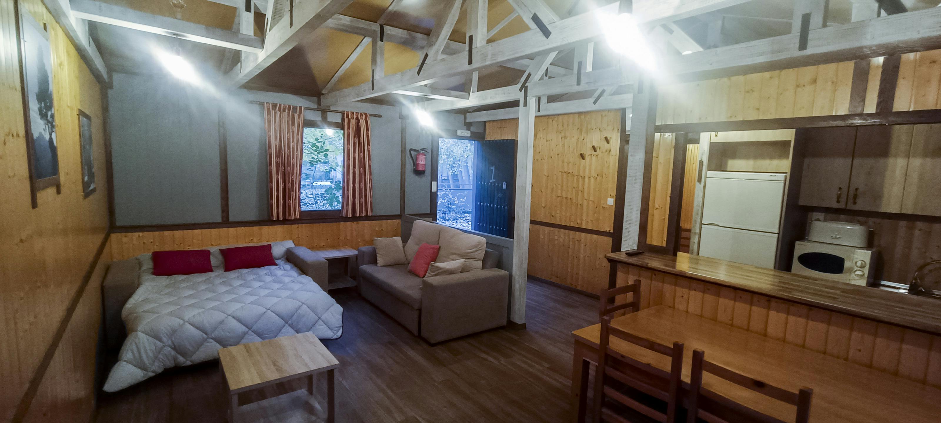 Our A-type cabins are spaces built on a single floor of 70 m² and for a maximum of 6 guests. The façade is made using rustic materials, while the entire interior is made of wood, with high-density insulation that will make you enjoy a pleasant climate at any time of the year. Our cabins are located in the Sierra del Segura within the Natural Park in the village of the same name, Vado de Tus. Enjoy one of the most charming spots in the entire area. Its beautiful orography, between the Calar del Mundo and the Calar de la Sima, next to the Tus River and the Infierno gorge, will make you spend a holiday to remember.