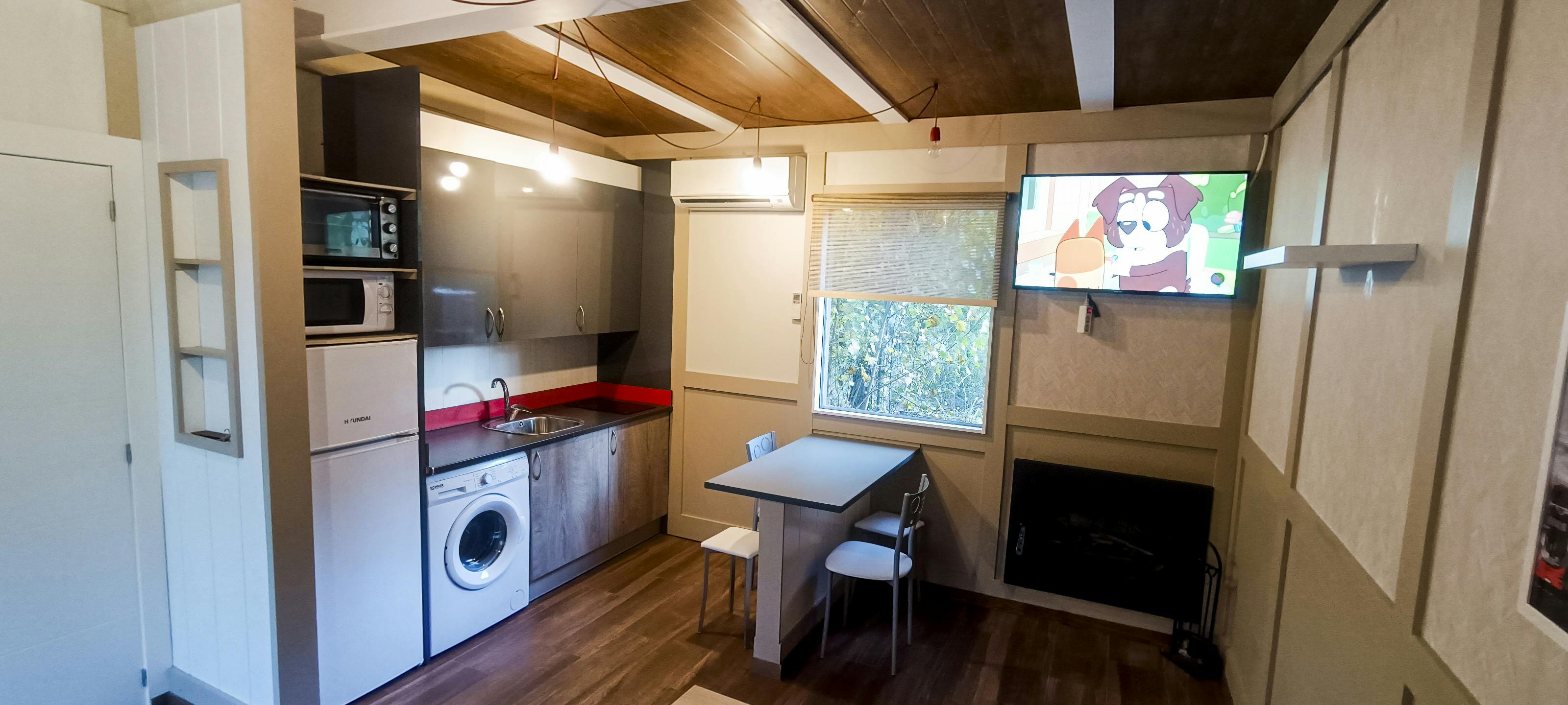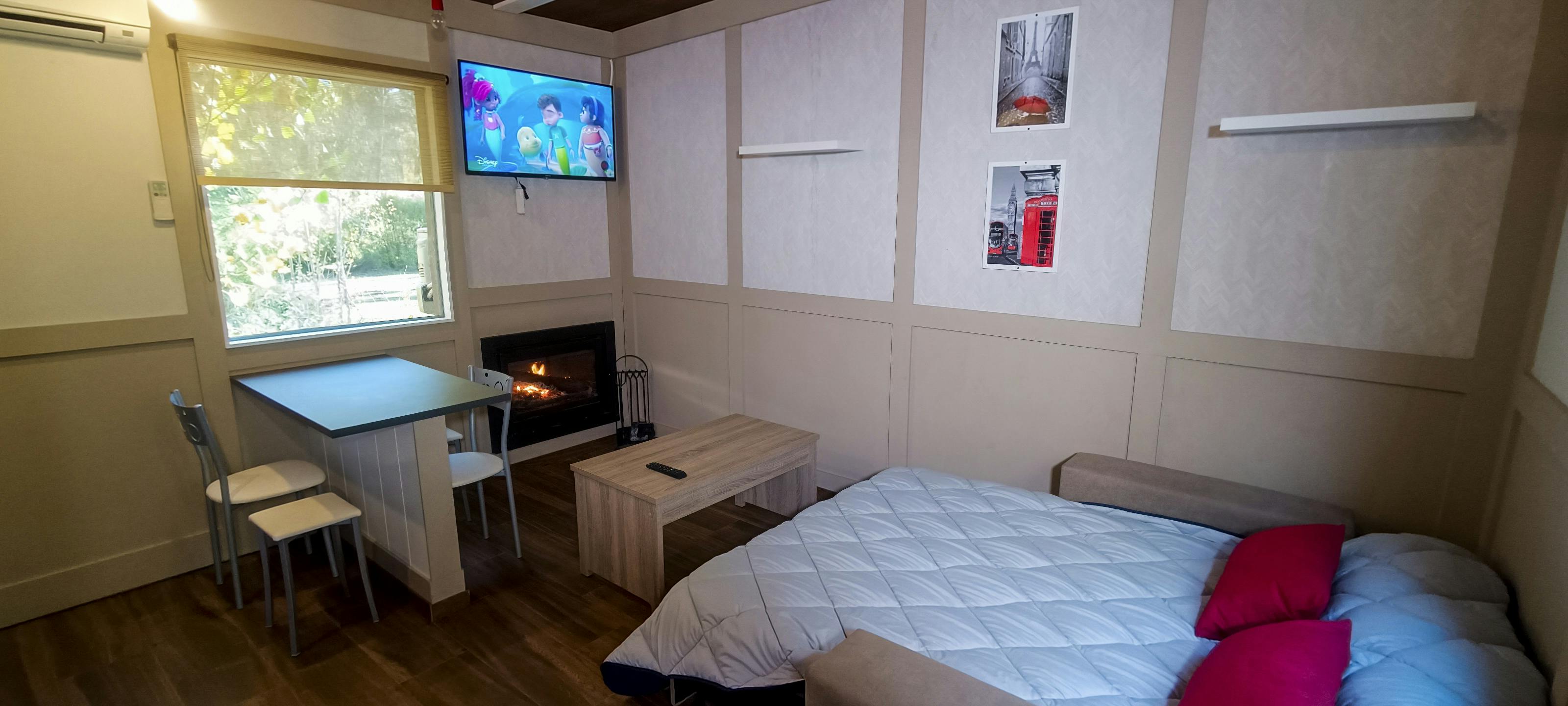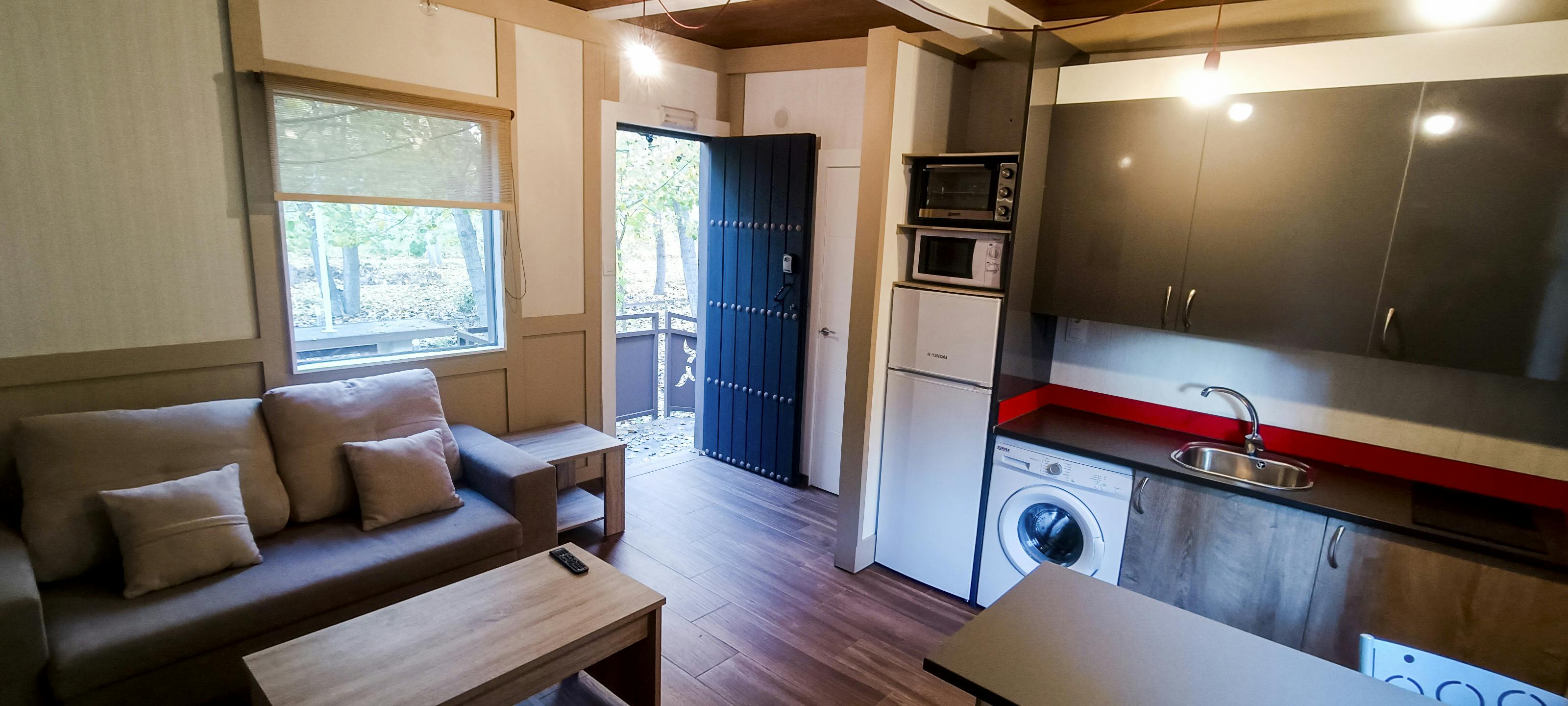 Our type B cabins are spaces built on a single floor of 30 m² and for a maximum of 4 guests. The façade is made using rustic materials, while the entire interior is made of wood, with high-density insulation that will make you enjoy a pleasant climate at any time of the year. Our cabins are located in the Sierra del Segura within the Natural Park in the village of the same name, Vado de Tus. Enjoy one of the most charming spots in the entire area. Its beautiful orography, between the Calar del Mundo and the Calar de la Sima, next to the Tus River and the Infierno gorge, will make you spend a holiday to remember.
